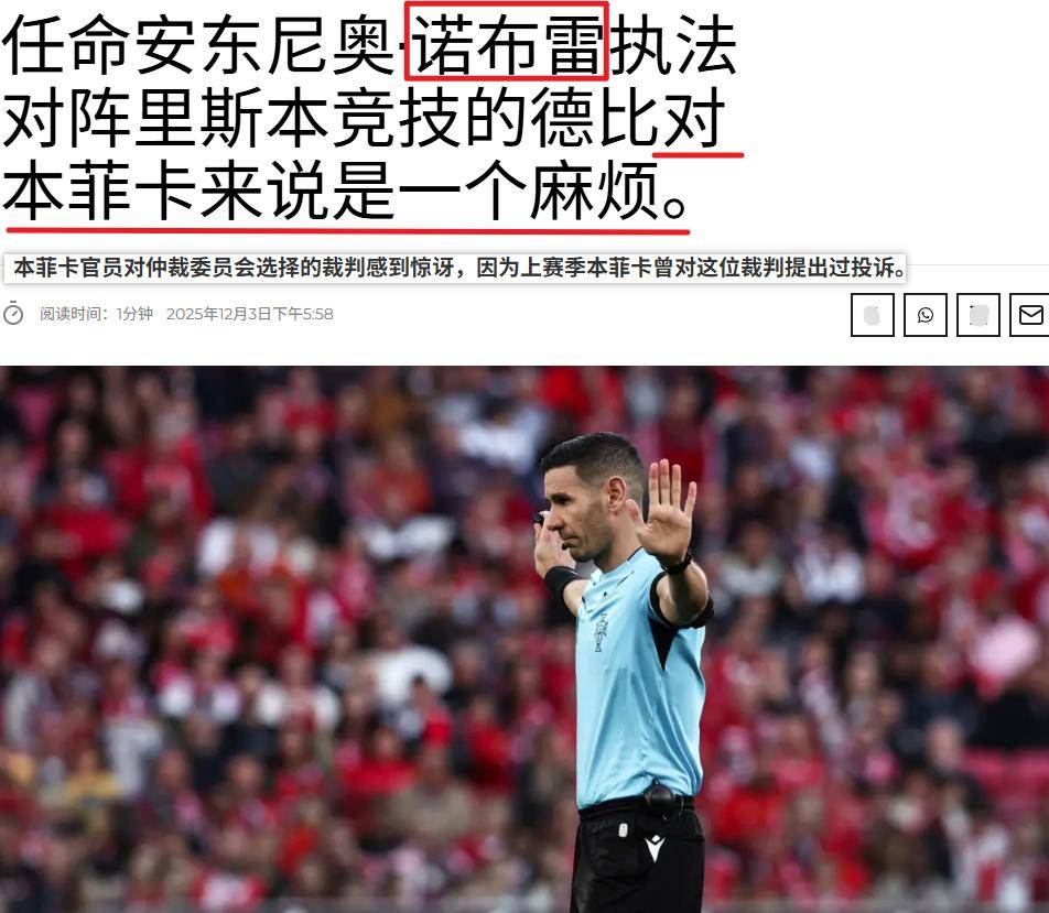 本场比赛的场外因素也同样引人关注。本菲卡官方对于主裁判安东尼奥·诺布雷的任命表达了强烈不满,甚至称其为“黑哨”。回顾诺布雷上赛季的执法尺度,确实存在一些争议判罚,似乎他对本菲卡并不那么友好。
